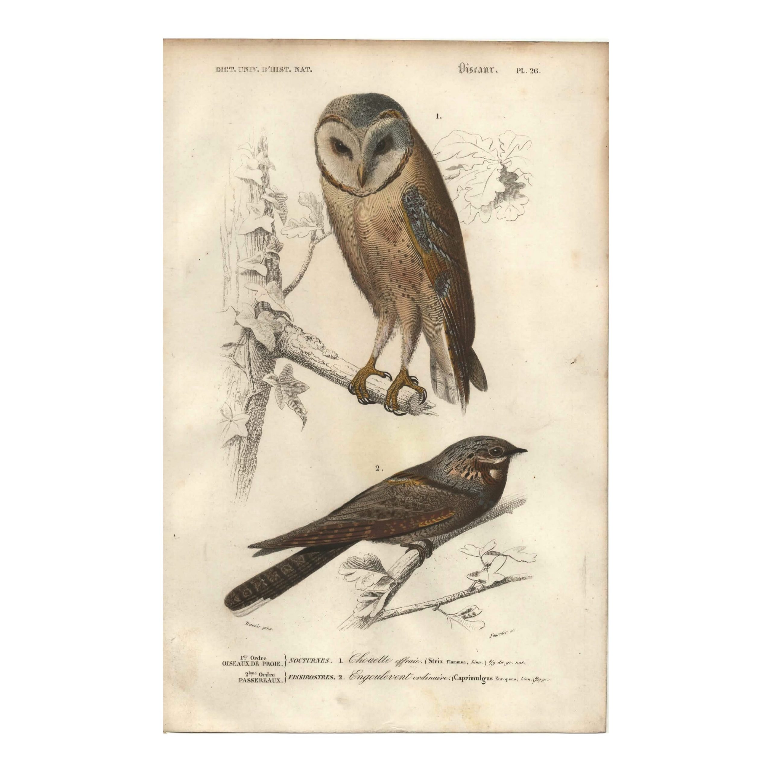 Chouette Effraie et Engoulevent : Planche authentique de 176 ans ans d’âge, pas une simple reproduction