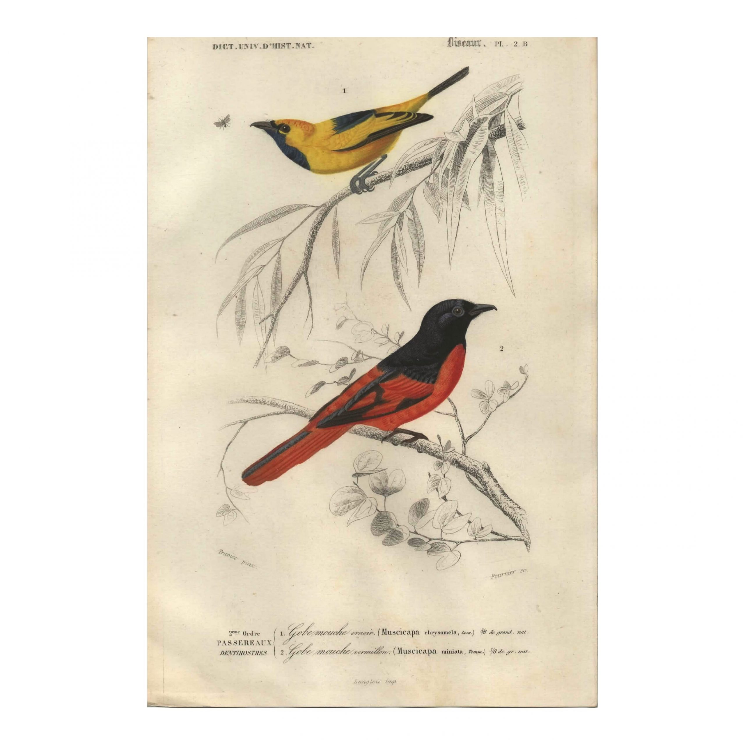 Gobe-Mouche Erneir et Vermillon : Planche authentique de 176 ans ans d’âge, pas une simple reproduction