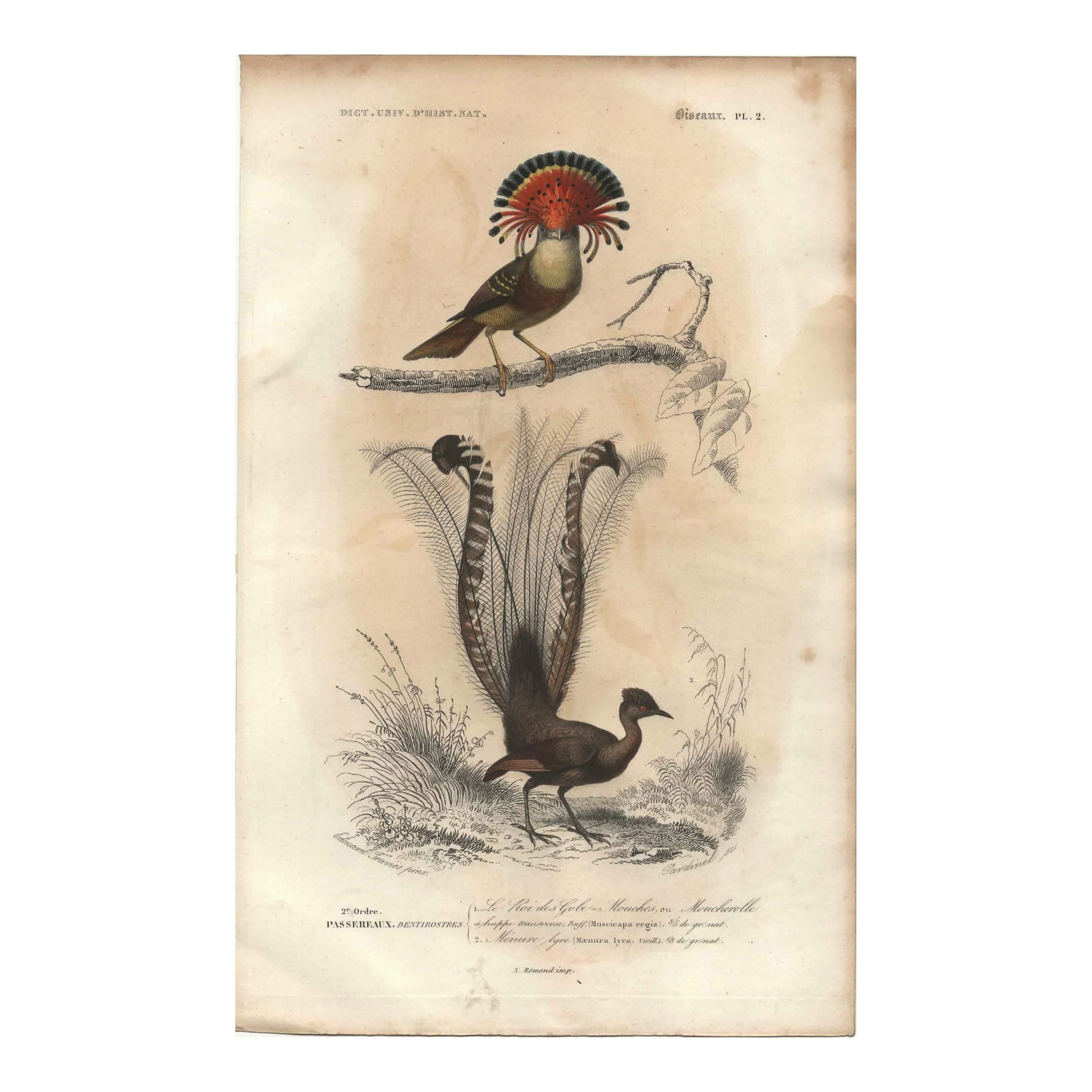 Gobe-Mouche et Ménure : Planche authentique de 176 ans ans d’âge, pas une simple reproduction