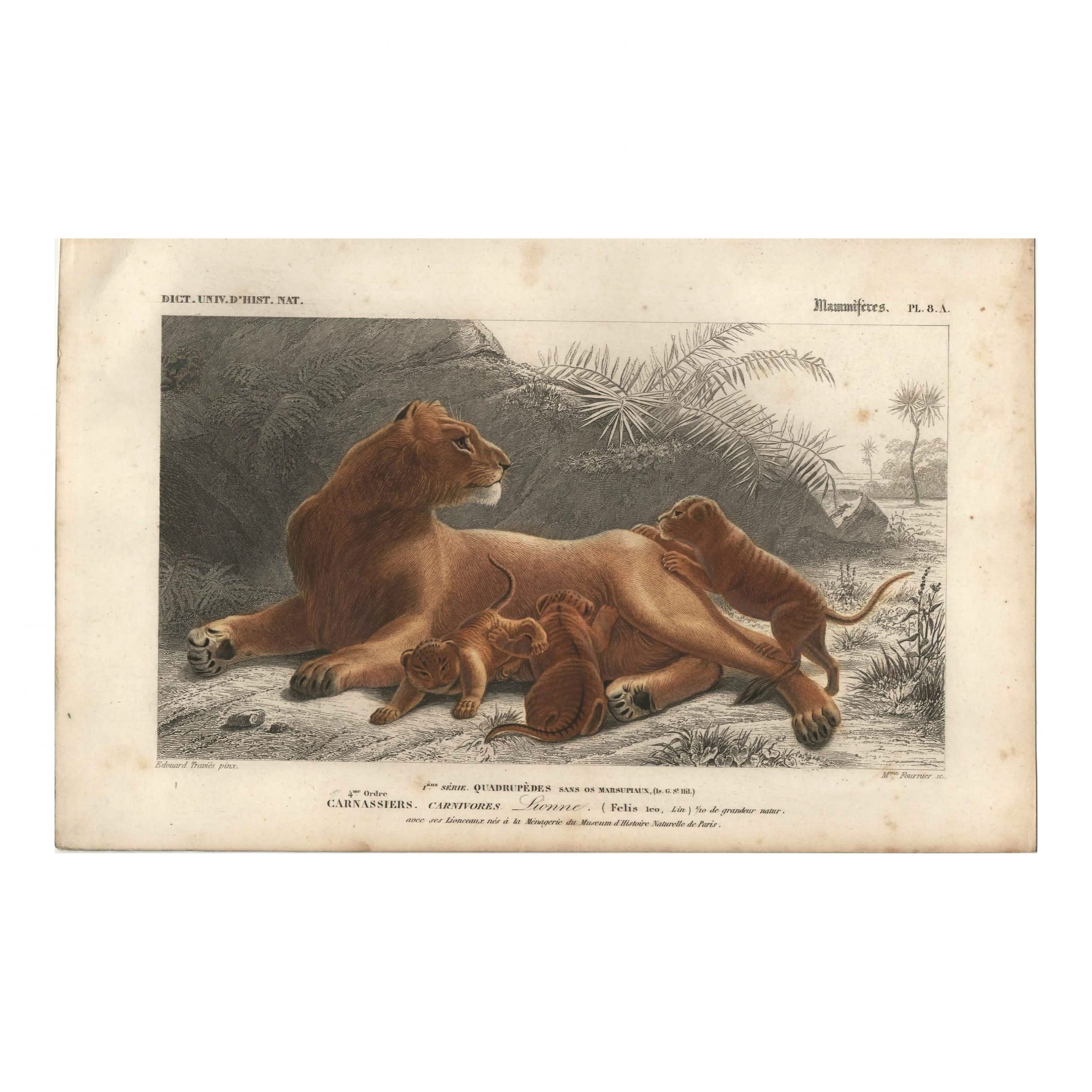 Lionne avec ses lionceaux : Planche authentique de 176 ans ans d’âge, pas une simple reproduction