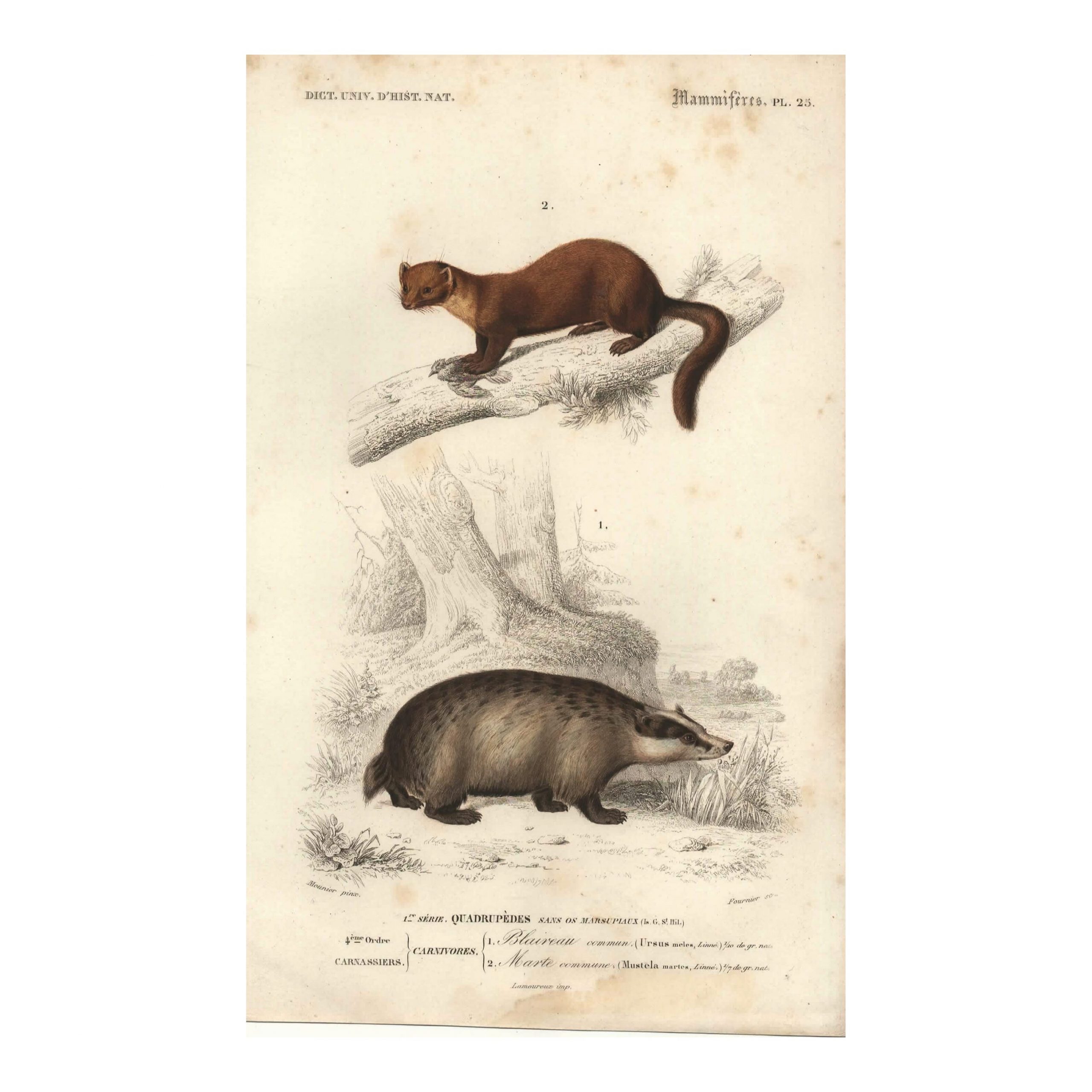 Blaireau et marte : Planche authentique de 176 ans ans d’âge, pas une simple reproduction